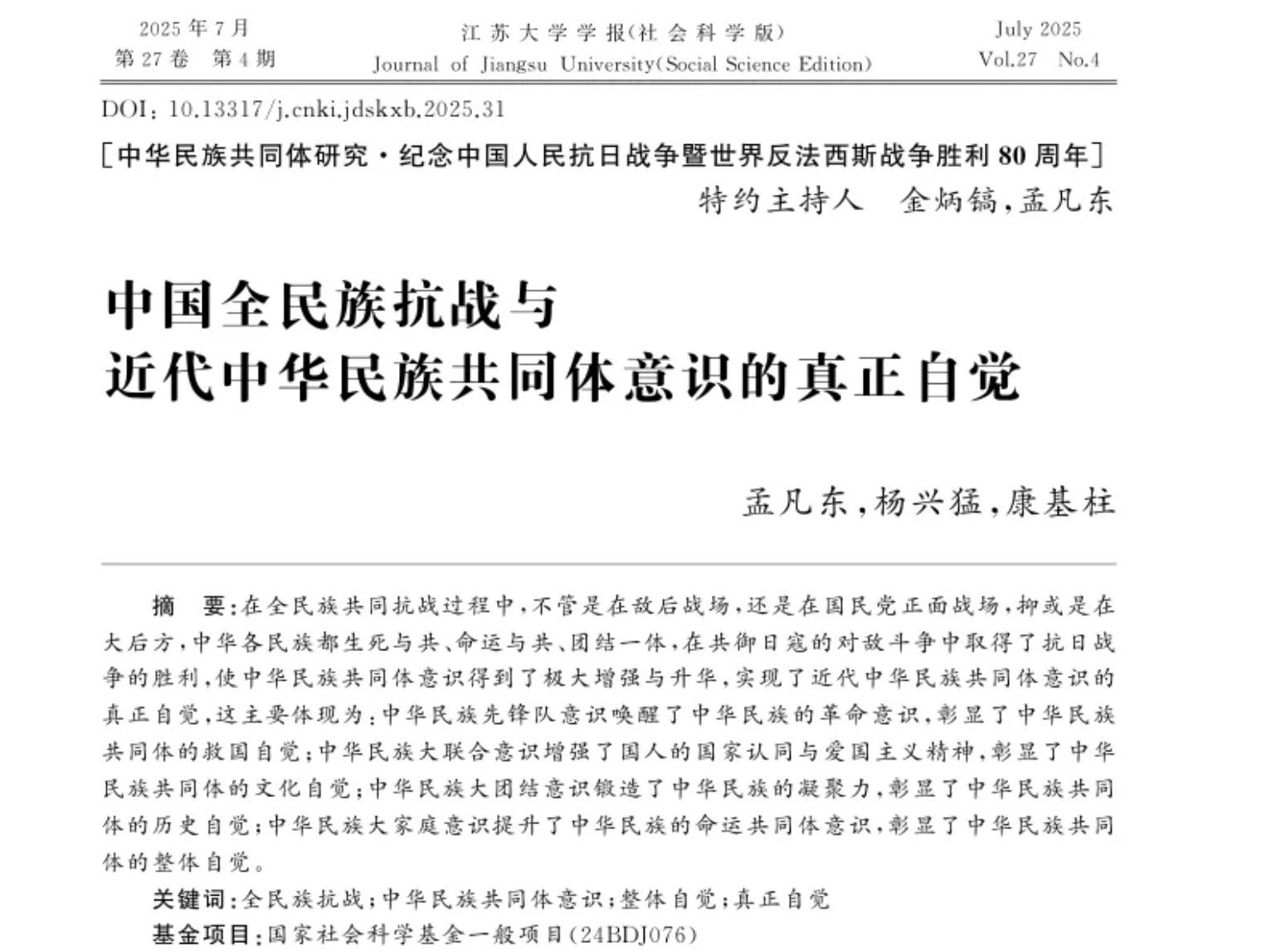 孟凡东教授、康基柱教授等在《江苏大学学报(社会科学版)》第4期的《中华民族共同体研究·纪念中国人民抗日战争暨世界反法西斯战争胜利80周年》的专题文章:《中国全民族抗战与近代中华民族共同体意识的真正自觉》。文章着力从纵向时间维度论证近代中华民族共同体意识真正自觉的历史生成,从内在系统结构论证整体自觉的要素构成,尝试呈现“中华民族共同体意识整体自觉”的真正内在逻辑与外部表征,进而全面明晰抗日战争时期中华民族共同体意识的基本要素和结构内容。在全民族共同抗战过程中,不管是在敌后战场,还是在国民党正面战场,抑或是在大后方,中华各民族都生死与共、命运与共、团结一体,在共御日寇的对敌斗争中取得了抗日战争的胜利,使中华民族共同体意识得到了极大增强与升华,实现了近代中华民族共同体意识的真正自觉,这主要体现为:中华民族先锋队意识唤醒了中华民族的革命意识,彰显了中华民族共同体的救国自觉;中华民族大联合意识增强了国人的国家认同与爱国主义精神,彰显了中华民族共同体的文化自觉;中华民族大团结意识锻造了中华民族的凝聚力,彰显了中华民族共同体的历史自觉;中华民族大家庭意识提升了中华民族的命运共同体意识,彰显了中华民族共同体的整体自觉。