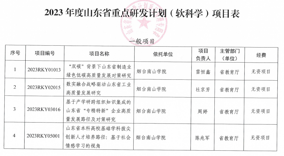 根据山东省科学技术厅文件(鲁科字〔2023〕64号)《山东省科学技术厅关于下达2023年度山东省重点研发计划(软科学项目)的通知》,今年全省共计立项231项,其中烟台南山学院立项4项,数量居山东省民办高校和驻烟高校首位。