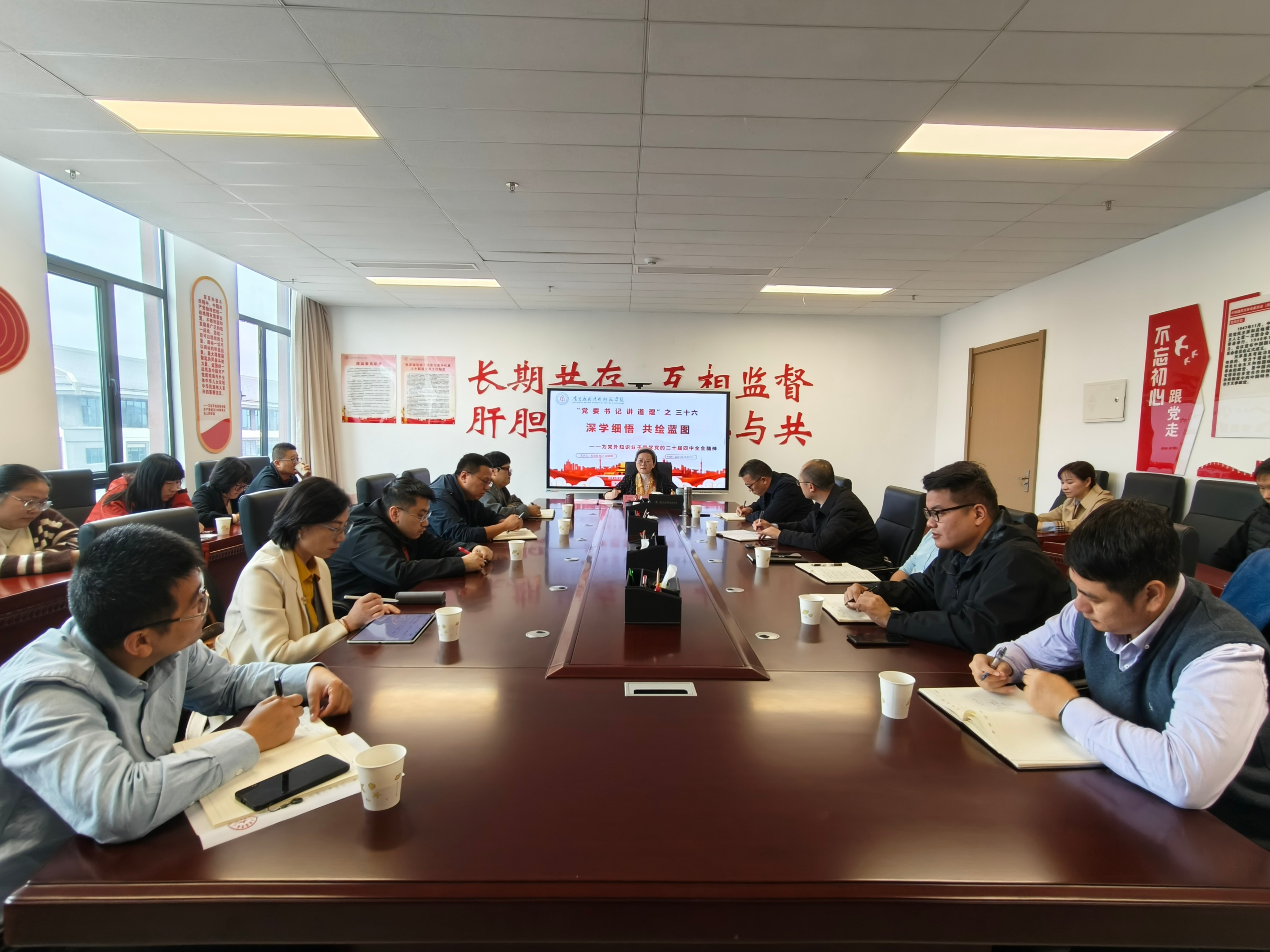 11月6日,党委委员、纪委书记、组织部部长杨冬为机关第三党支部讲党课,宣讲党的二十届四中全会精神。支部全体党员、入党积极分子参加。 杨冬围绕“党的二十届四中全会公报”讲授专题党课,系统解读公报核心要义与战略部署,重点阐述全面深化改革、推进中国式现代化的重大意义与实践路径。他强调,全体党员要深刻领悟“两个确立”的决定性意义,增强“四个意识”、坚定“四个自信”、做到“两个维护”,统一思想行动,为学校发展和“十五五”规划目标贡献力量。全体党员纷纷表示,要认真学习领会党的二十届四中全会精神,深化理论武装,筑牢思想根基,将会议精神落实到工作中,把学习成果转化为推动学校高质量发展的实际成效。(文图/程文斌,一审/常虹,二审/夏丽丽,三审/杨冬)
