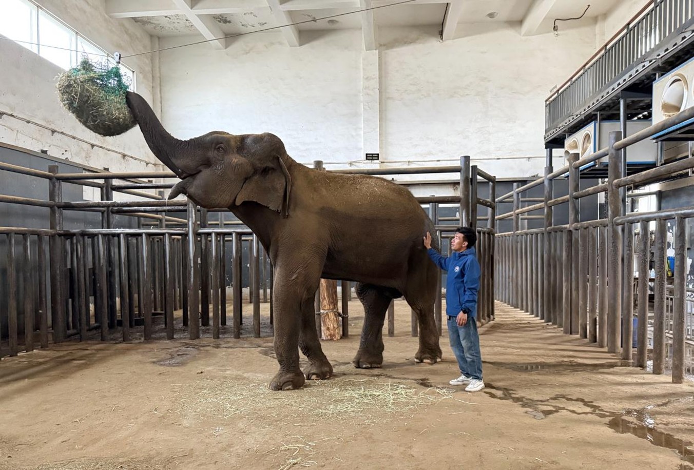 然而,当宏观蓝图落向每一个具体生命的真实处境时,“生态整体性”中那份超越物种与功利的情感联结,究竟该如何理解?答案,或许就藏在保护园的一角——一头名叫嘎赛的亚洲象与饲养员索朗次仁的日常里。嘎赛年逾四十,独居于海拔3600米的拉萨河谷。一日,和马町走进象舍,与饲养员索朗次仁演交流“丰容”措施:用鲜枝替换干草,增设藏觅食网袋和蹭痒的木桩,引导嘎赛主动探索,缓解圈养焦虑。站在一旁的次仁认真记录并不时追问细节。他兴奋地表示:“我马上就来调整,让它生活得更自在。”