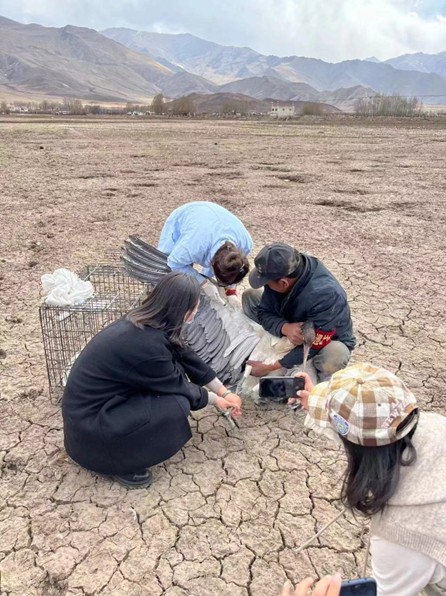 那曲市色尼区罗玛镇,兽医扎西德吉和林草局工作人员正在为一只受伤的黑颈鹤进行检查。