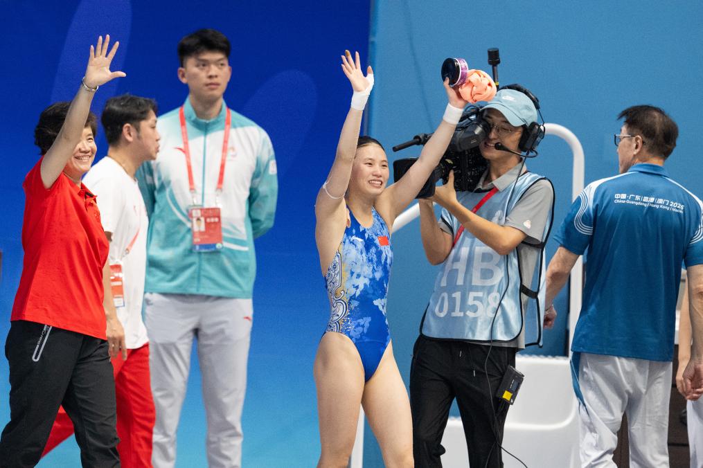 在10日晚进行的第十五届全国运动会跳水女子10米跳台决赛中,代表上海队参赛的陈芋汐一路领先,收获金牌。赛后,她与教练轻轻踏上领奖台,微笑着向全场观众致意。